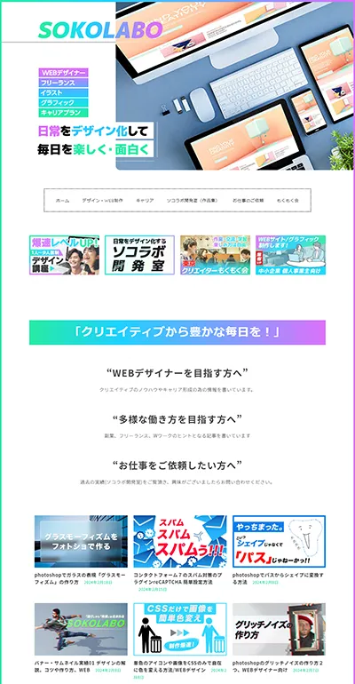 WEBデザインを軸に、グラフィック、DTP、プロダクトデザイン、コーディング、運用、ディレクション、ブログ運営など、幅広く業務を経験し、多角的な視点からWEB制作を行うことが可能です。